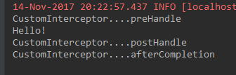 1 2 3 4 5 6 7 8 9 10 11 12 13 14 15 16 17 18 19 20 21 22 23 24 25 package com.wx.interceotor;import javax.servlet.http.HttpServletRequest;import javax.servlet.http.HttpServletResponse;import org.springframework.web.servlet.HandlerInterceptor;import org.springframework.web.servlet.ModelAndView;public class DiyInterceptor implements HandlerInterceptor { public boolean preHandle (HttpServletRequest request, HttpServletResponse response, Object handler) throws Exception { System.out.println("preHandle======" ); return false ; } public void postHandle (HttpServletRequest request, HttpServletResponse response, Object handler, ModelAndView modelAndView) throws Exception { System.out.println("postHandle======" ); } public void afterCompletion (HttpServletRequest request, HttpServletResponse response, Object handler, Exception ex) throws Exception { System.out.println("afterCompletion======" ); } }