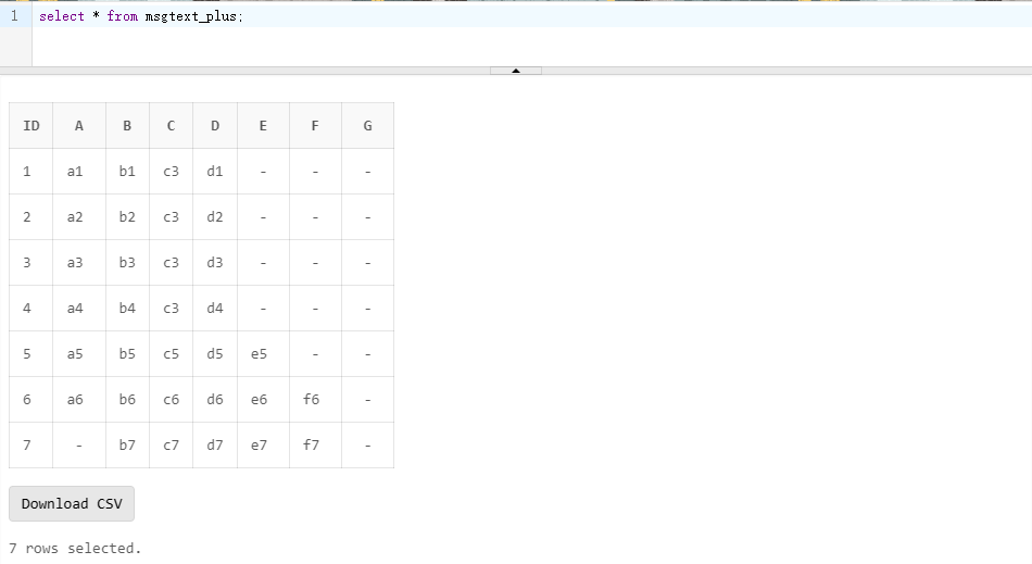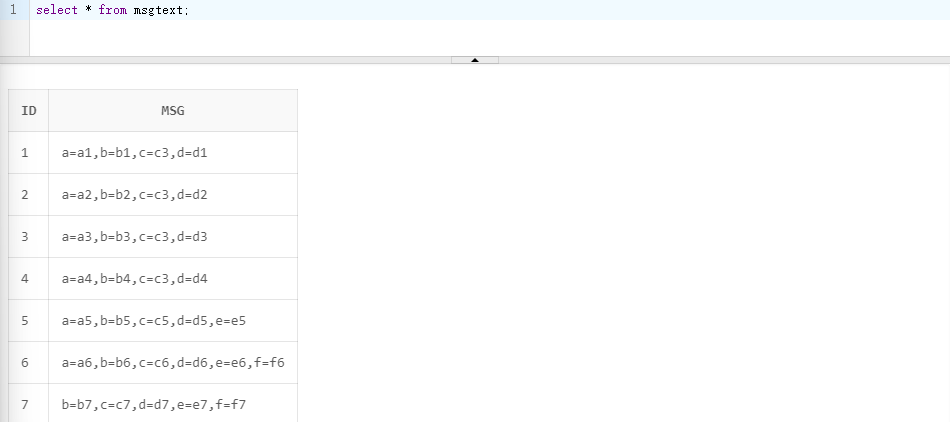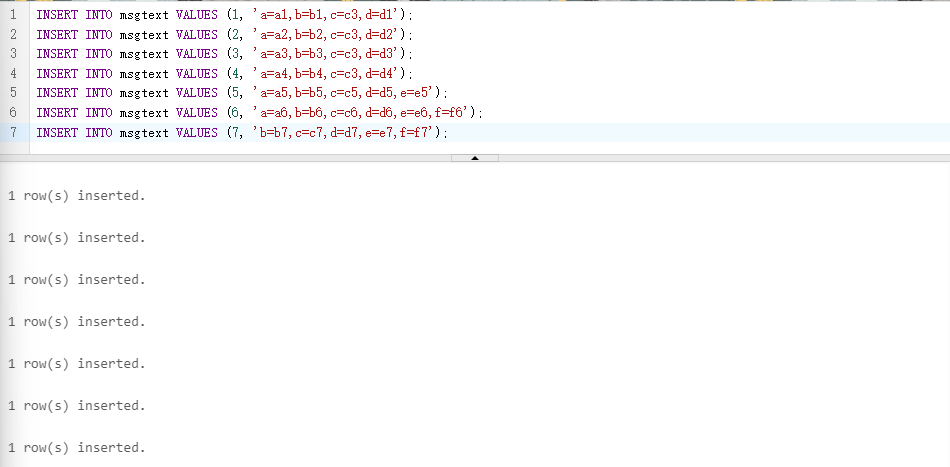 INSERT INTO msgtext VALUES (7, 'b=b7,c=c7,d=d7,e=e7,f=f7');![]()