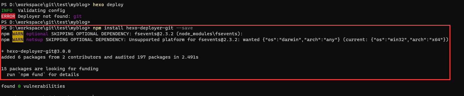 报错了!!!!不要慌,我们还需要安装一个git的插件才能部署,执行以下命令安装