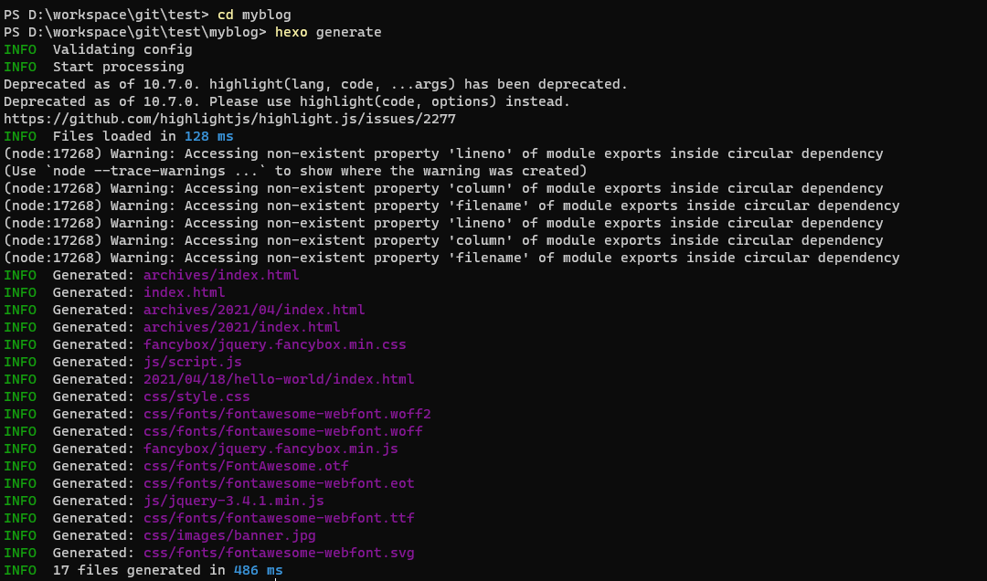 可以看到文件夹内有很多初始文件,我们先不管这些是啥,操作一波再说 接下来我们进入博客项目文件夹里面,然后用 generate 命令 将博客编译成html静态网页
