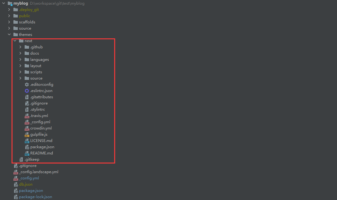执行完毕之后 Next 主题的源码就会出现在项目的themes/next 文件夹下。